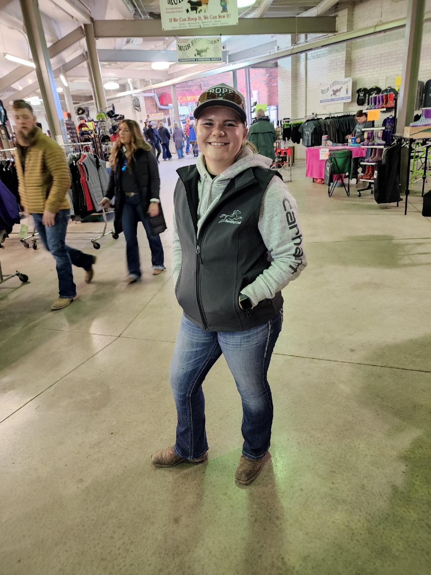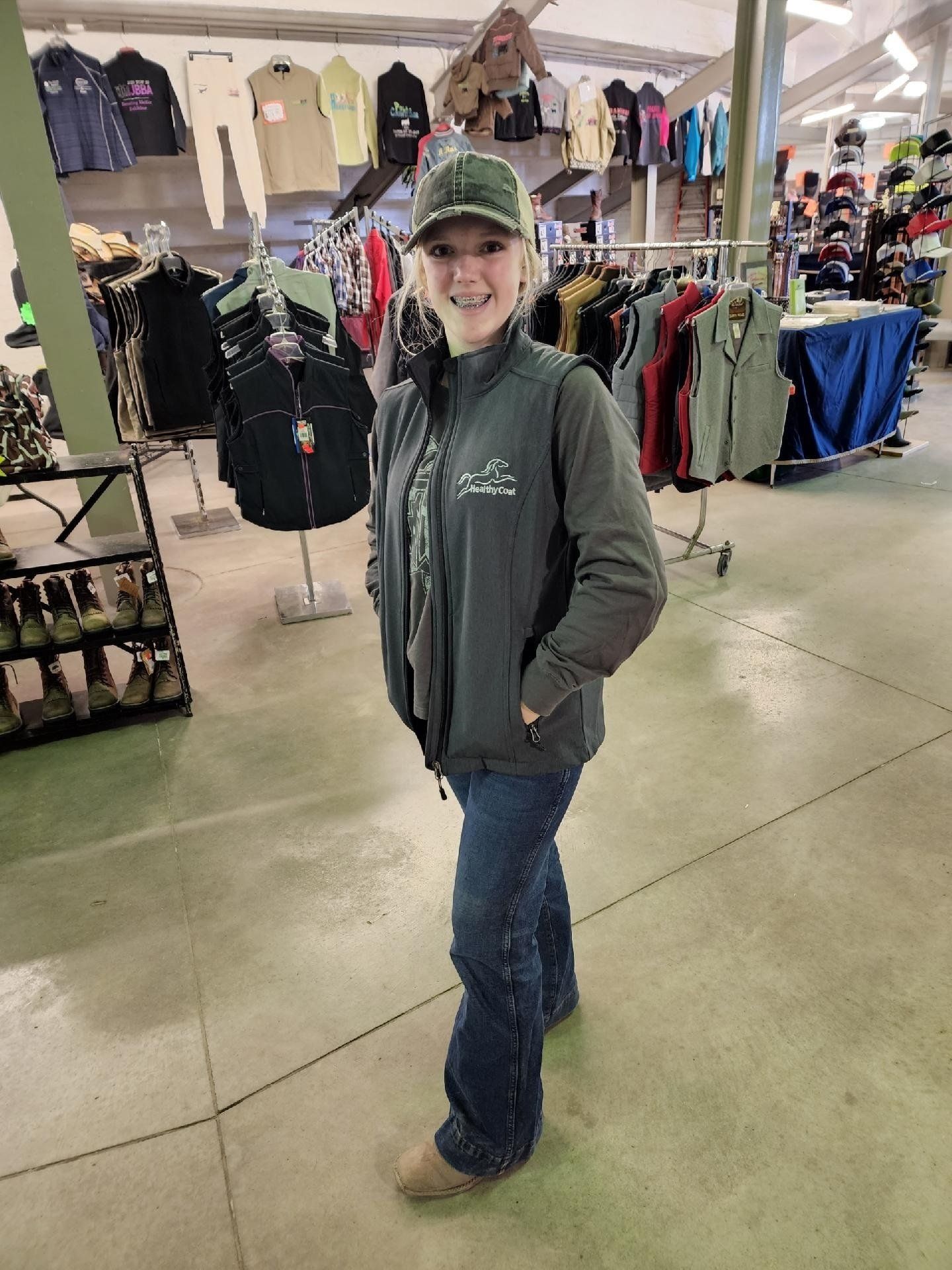 Mac Kenzie at the Iowa Horse Fair wearing her HealthyCoat vest
